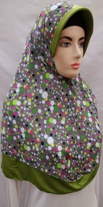 Model Jilbab Instan dengan Kombinasi Polos dan Motif Polkadot.