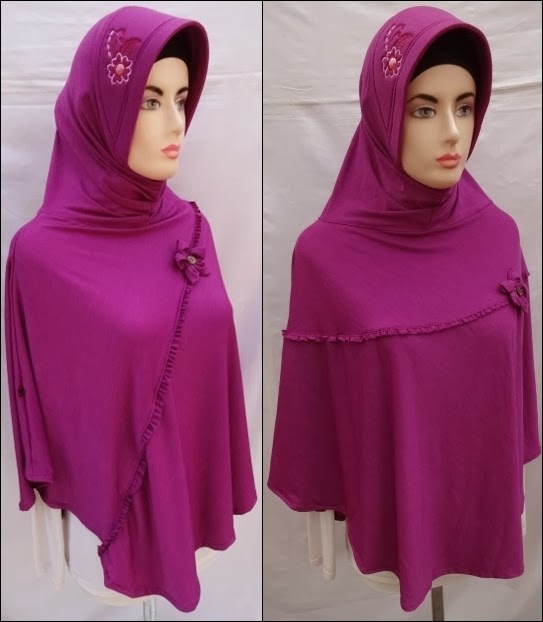 Model Jilbab Jumbo Polos dengan Bordir berbentuk baygon di samping kepala dan di bagian depan terdapat haisan rempel dan Bunga.