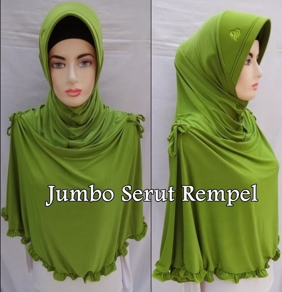 Model Jilbab Jumbo dengan hiasan Serut Tali dan Rempel pada Jilbab.